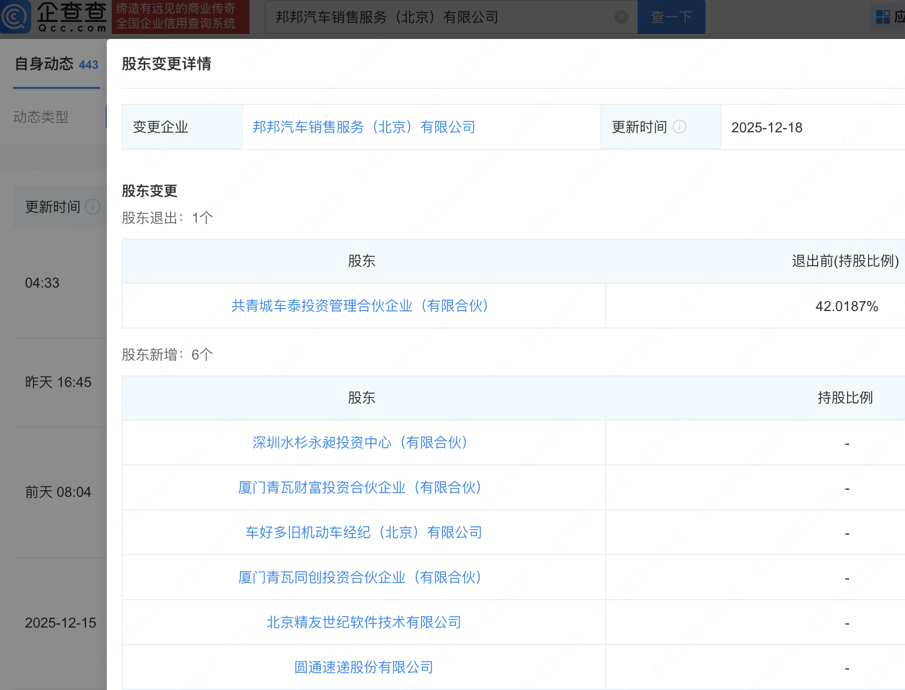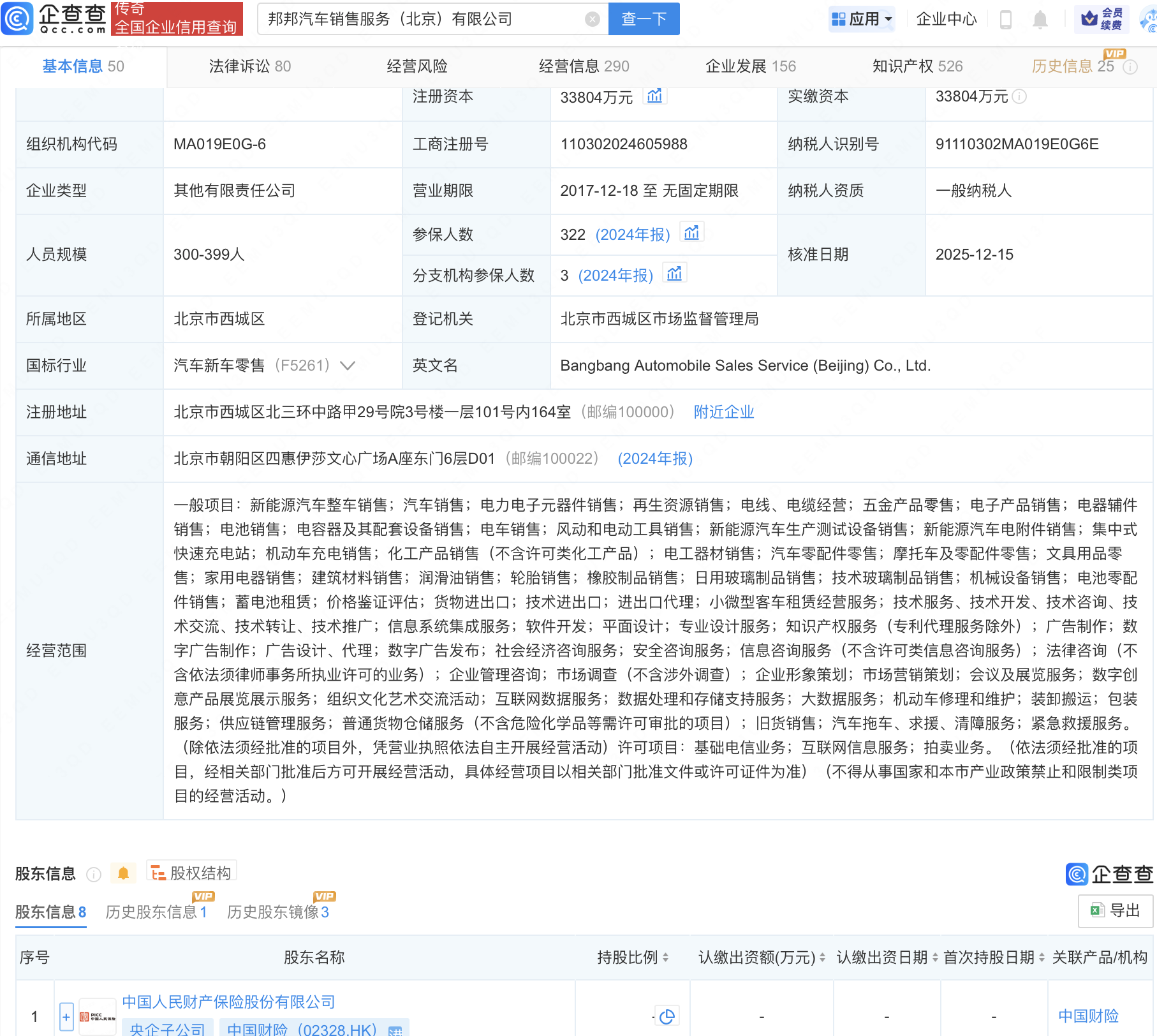 近日,邦邦汽服关联公司邦邦汽车销售服务(北京)有限公司发生工商变更安信,新增圆通速递(600233)、瓜子二手车关联公司车好多旧机动车经纪(北京)有限公司等为股东。企查查信息显示,该公司成立于2017年,经营范围包含:新能源汽车整车销售;汽车销售;电力电子元器件销售;再生资源销售等,现由中国财险(02328.HK)等及上述新增股东共同持股。公开信息显示,邦邦汽服是一家车后产业互联网平台企业。